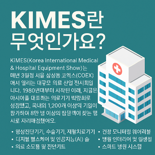KIMES(Korea International Medical & Hospital Equipment Show)는 매년 3월경 서울 삼성동 코엑스(COEX)에서 열리는 대규모 의료 산업 전시회입니다. 1980년대부터 시작된 이래, 지금은 아시아를 대표하는 의료기기 박람회로 성장했고, 국내외 1,200개 이상의 기업이 참가하며 8만 명 이상의 참관객이 찾는 행사로 자리매김했어요. 특히 KIMES는 단순히 제품 전시를 넘어서, 다양한 체험존과 시연 프로그램을 통해 관람객이 직접 제품을 보고 듣고 만지며 이해할 수 있도록 구성되어 있어요. 병원 관계자나 의료기기 업계 종사자뿐만 아니라, 건강관리에 관심 있는 일반인, 의료 관련 전공 학생 등 다양한 계층의 방문자들이 미래 의료의 흐름을 체험할 수 있는 살아 있는 플랫폼이라 할 수 있습니다. 즉, KIMES는 변화하는 의료기술의 최전선에서 ‘미래 병원의 모습’을 가장 가까이에서 보고, 체험하고, 연결할 수 있는 특별한 기회를 제공하는 소중한 공간입니다.