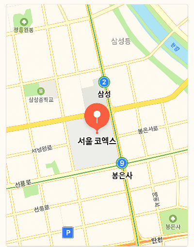 또한 지하철 9호선 봉은사역에서도 도보 약 10분 내외로 접근 가능하므로, 출발 위치에 따라 적절한 노선을 선택하시면 됩니다. 봉은사역은 전시장 남동쪽에 위치해 있으며, 삼성역과 함께 코엑스를 둘러싸고 있어 복수 노선 이용이 가능합니다.